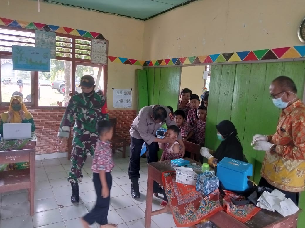 Babinsa dan Bhabinkamtibmas, Kawal Vaksinasi Anak di SDN 152 Rimbo Ulu