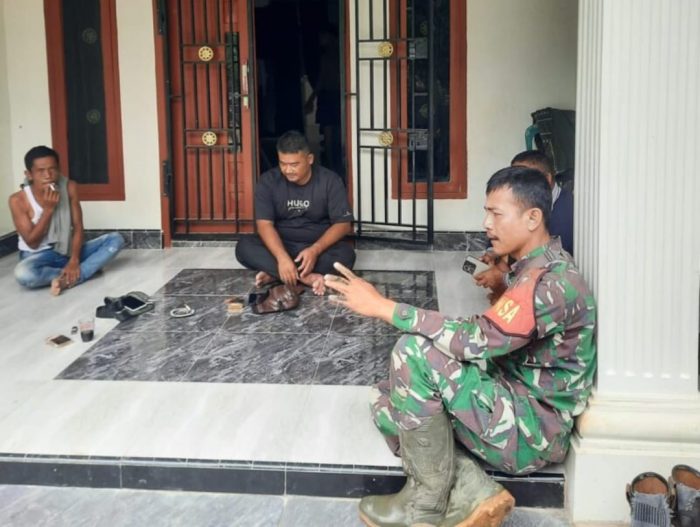 Babinsa Serma Eko Purba melaksanakan komsos bersama warga Desa Timbolasi, Kecamatan Bathin III Ulu, Kabupaten Bungo. Foto: Sari
