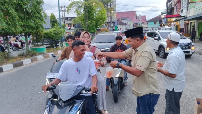 Ratusan takjil yang terdiri dari kue kue, es buah, kolak hanya dalam hitungan menit habis dibagikan kepada pengguna jalan di bundaran pasar Bawah Muara Bungo, Sabtu (14/3/2026).