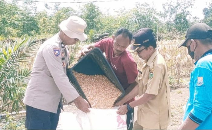 Bhabinkamtibmas Polsek Rimbo Ilir, Aiptu Dadan Juanda, S.Sos, bersama petani dan perangkat desa membantu memipil serta mengemas hasil panen jagung di Desa Giriwinangun, Kecamatan Rimbo Ilir, Kabupaten Tebo, sebagai bentuk dukungan terhadap program ketahanan pangan nasional. Foto: Amir