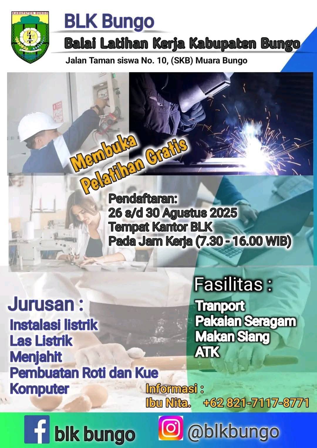 Informasi ini disampaikan melalui akun Instagram resmi @blk_bungo hallo kantinaker, Pendaftaran Pelatihan keterampilan kerja sudah dibuka…!!! saatnya raih dan tingkatkan keterampilanmu… Ayo daftarkan sekarang juga…..