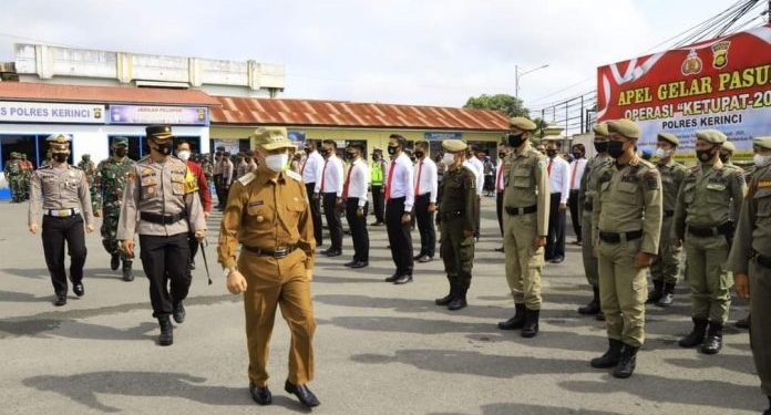 KERINCI – Bupati Kerinci, Adirozal menjadi Inspektur Upacara pada apel gelar pasukan Operasi Ketupat 2021, Apel pengamanan Idul Fitri ini digelar di halaman Mapolres Kerinci, Rabu (05/05).