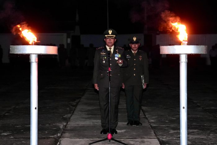 Bertindak sebagai komandan upacara apel Kehormatan dan Renungan suci Kapten Inf Mairi Hendra sementara Perwira upacara Lettu Inf Sahita Gurusinga pada pukul 24.00 WIB.