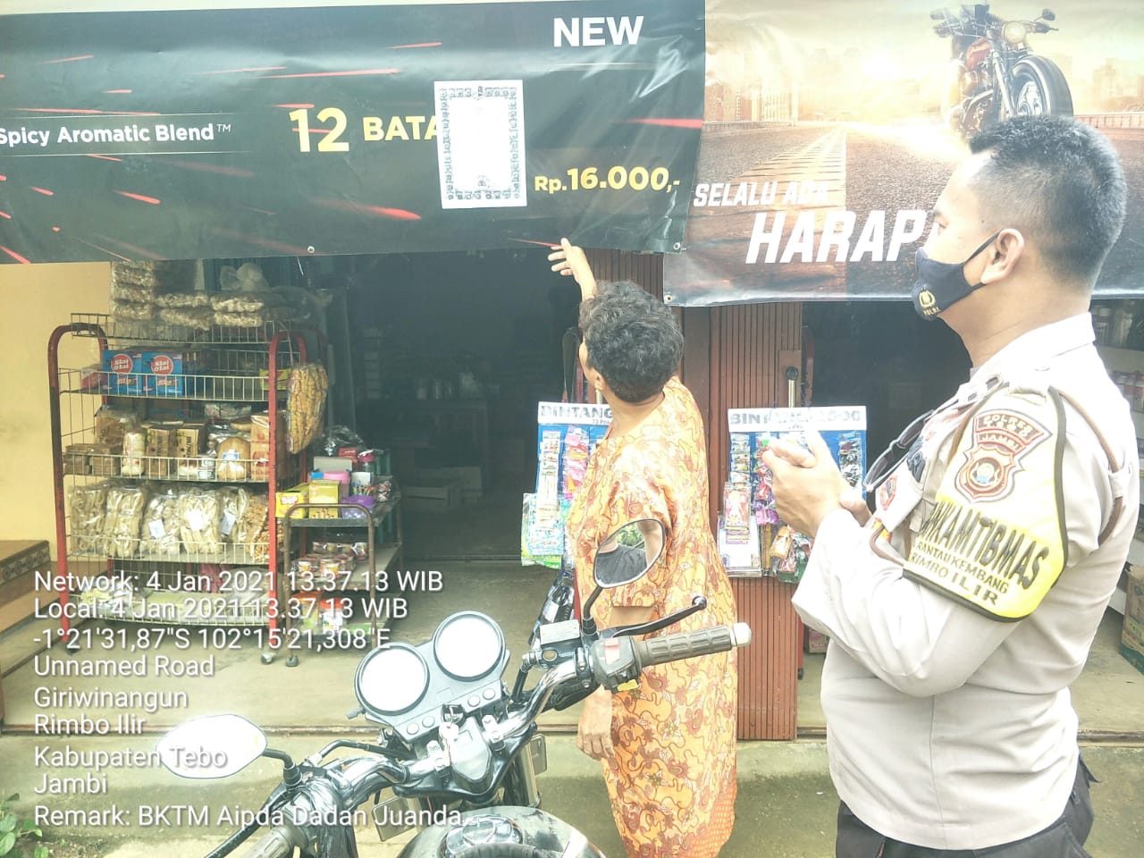 SIDAKPOST.ID, TEBO – Aipda Dadan Juanda Bhabinkamtibmas (BKTM) Polsek Rimbo Ilir Polres Tebo giat melakukan sosialisasi Maklumat Kapolri Nomor MAK/1/2021 tanggal 1 Januari 2021, tentang Kepatuhan terhadap Larangan kegiatan Penggunaan Simbol dan Atribut serta penghentian Kegiatan Front Pembela Islam (FPI). Bertempat di Desa Giriwinangun Kecamatan Rimbo Ilir Kabupaten Tebo, Selasa (05/01/2021).
