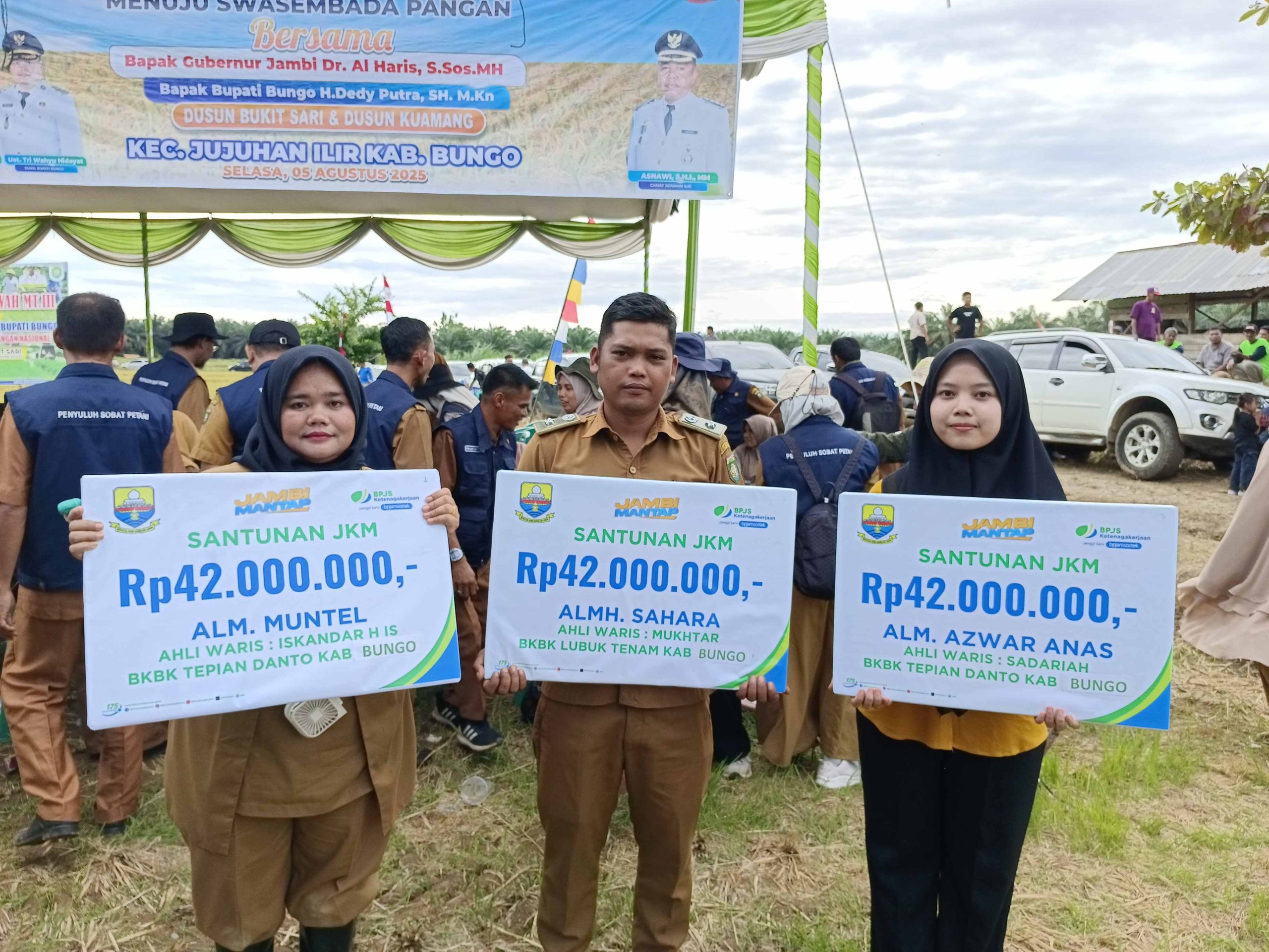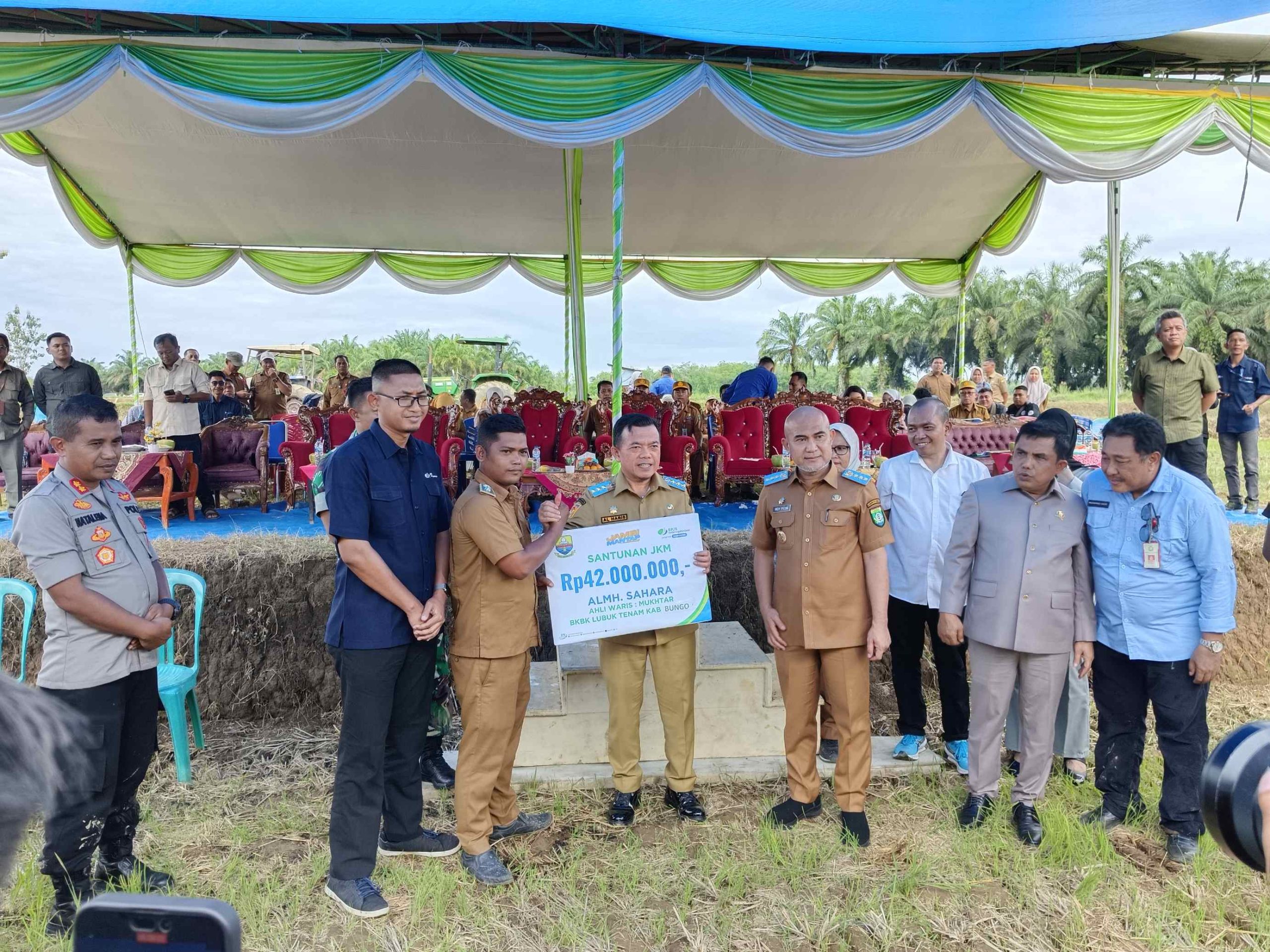 Penyerahan santunan ini bertepatan dengan acara panen raya dan tanam padi sawah, di Dusun Bukit Sari, Kecamatan Jujuhan Ilir.