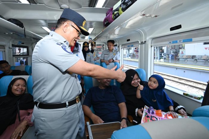Direktur Jasa Raharja menyapa pemudik di dalam kereta pada Program Mudik Gratis BUMN 2026 di Stasiun Pasar Senen. Foto: Humas Jasa Raharja