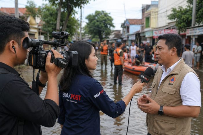 Ilustrasi jurnalis saat meliput musibah banjir di lapangan. Foto : doc sidakpost.id