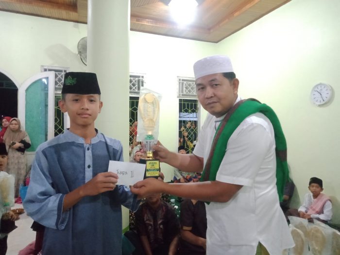 Ketua JOIN Jambi, Zakaria saat membagikan piala dan uang pembinaan kepada para pemenang di MTQ tingkat Dusun Mangun Jayo. Foto : sidakpost.id/Idris. Biro Bungo