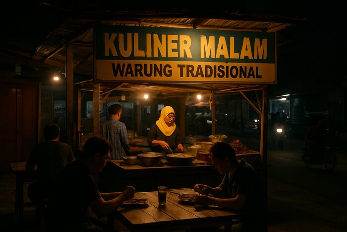 Ilustrasi Suasana kuliner malam di Jambi dengan warung tradisional sederhana yang tetap buka hingga larut, menghadirkan hidangan hangat bagi para pengunjung. Gambar: AI