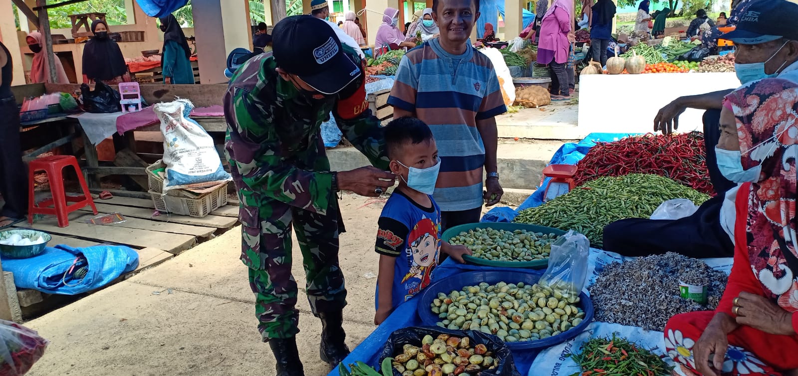 Babinsa Sertu Toni Daryono dalam giat menyambangi Pasar guna membantu pemerintah mensosialisasikan kepada masyarakat, supaya penuh kesadaran dan disiplin terhadap penerapan protokol kesehatan (prokes) untuk mencegah serta memutuskan mata rantai penyebaran Covid-19.