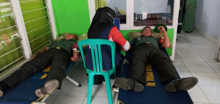 Babinsa Serda Badrus Samsi Hartanto mengikuti donor darah, di Polkes 02.10.11 Bute. Foto : sidakpost.id/Amir. Biro Tebo