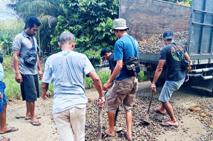 Tampak anggota Gertak'S Rimbo Ilir bersama warga, sedang menambal jalan rusak berlobang. Foto : Amir