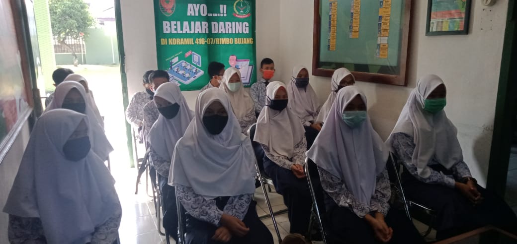 Belajar daring di Makoramil 416-07/Rimbo Bujang dilaksanakan pada setiap Hari Senin sampai dengan Hari Sabtu, belajar daring jam 08.00 – 10.00 wib untuk Siswa SMP dan jam 10.00 – 12.00 wib untuk Siswa SMA, dengan menerapkan protokol kesehatan.
