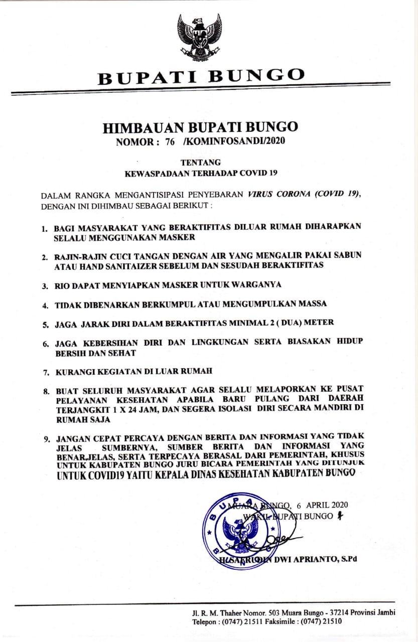 Hal itu Sesuai dengan surat Himbauan nomor : 76/Kominfosandi/2020, tertanda tangani Wakil bupati bungo H Safrudin dwi aprianto, S.Pd