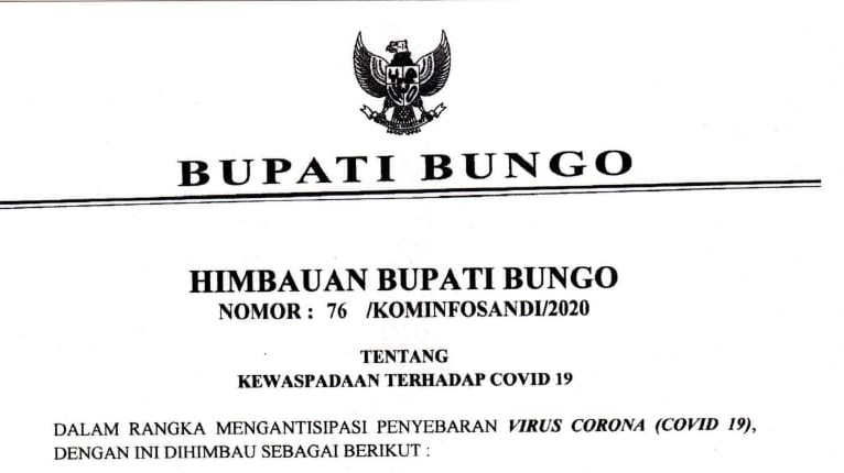SIDAKPOST.ID,BUNGO– Pemerintah daerah Kabupaten Kungo untuk kesekian kalinya kembali menerbitkan Surat edaran tentang kewaspadaan terkait penyebaran virus Corona (Covid-19),