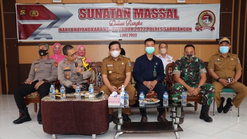 SAROLANGUN – Penjabat Bupati Sarolangun Henrizal, S.Pt, MM menghadiri kegiatan khitan massal, vaksinasi dan pengobatan gratis dalam rangka memperingati HUT Bhayangkara ke-76 tahun 2022 di Mapolres Sarolangun, Senin (20/06/2022).