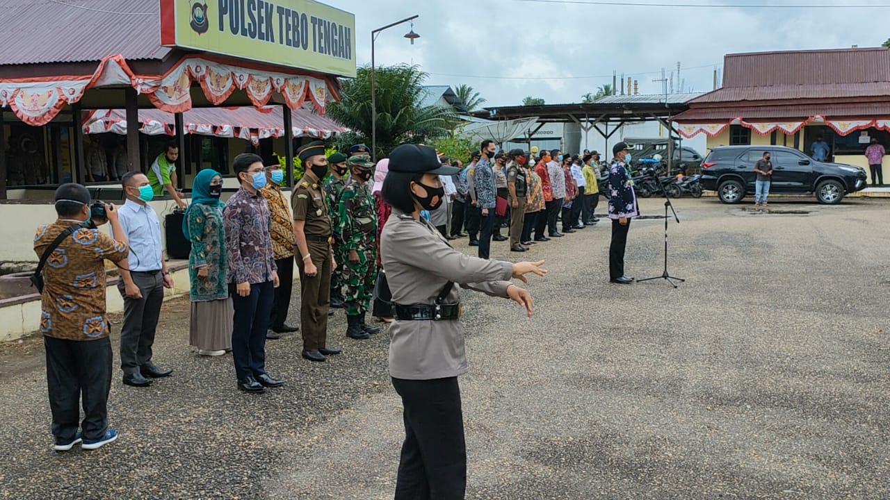 SIDAKPOST.ID, TEBO – Polres Tebo, menggelar apel dan kempanya jaga jarak dan pembagian masker, menghindari kerumunan dan pilkada serentak 2020 di halama, Mapolsek Tebo Tengah, Kamis (10/09).