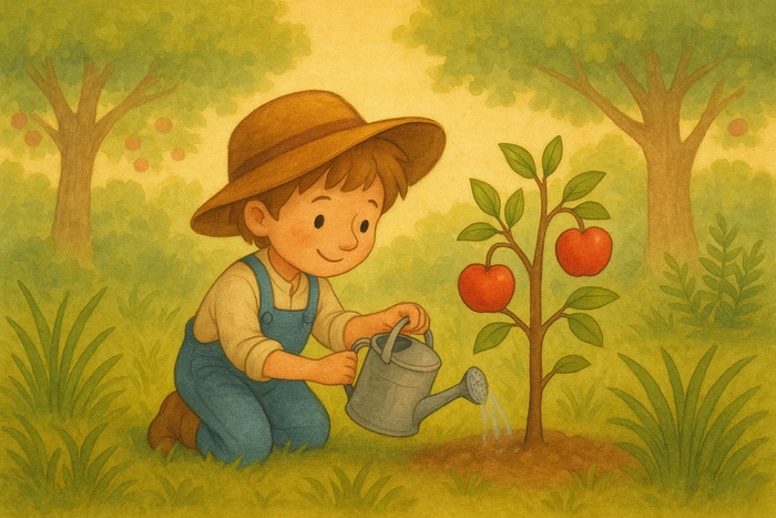 Di sebuah desa kecil, tinggal seorang anak laki-laki bernama Raka. Suatu hari, ia menanam biji apel di halaman rumahnya. Ia sangat bersemangat, membayangkan pohon besar dengan buah merah yang ranum.