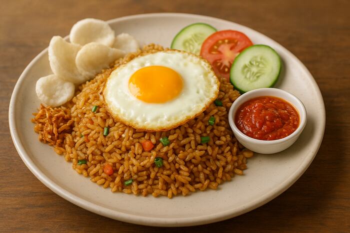 Sepiring nasi goreng khas Indonesia dengan telur mata sapi, kerupuk, sambal, serta irisan tomat dan mentimun sebagai pelengkap. Gambar: AI
