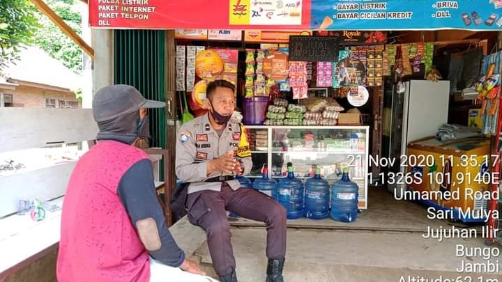 SIDAKPOST.ID, TEBO – Tiada kata lelah, Bhabinkamtibmas Polsek VII Koto, Aipda Syah Hendra, sambangi toko masyarakat untuk menyampaikan pesan kamtibmas.