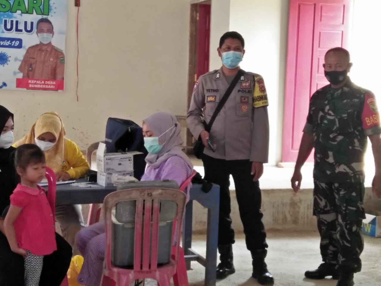 Serka Sukarman dan Bripka Suyatno melakukan monitoring dan pengawalan warga yang akan mengikuti Suntik Vaksinasi Covid-19, bertempat di Desa Sumbersari Kecamatan Rimbo Ulu Kabupaten Tebo.