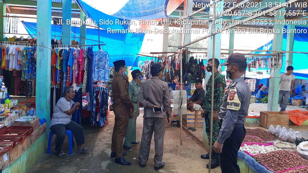 Kali ini menyambangi Pasar Kalangan Sidorukun Kecamatan Rimbo Ulu Kabupaten Tebo unruk memonitoring kepatuhan para pedagang dan pengunjung Pasar, dalam menerapkan peotokol kesehatan.