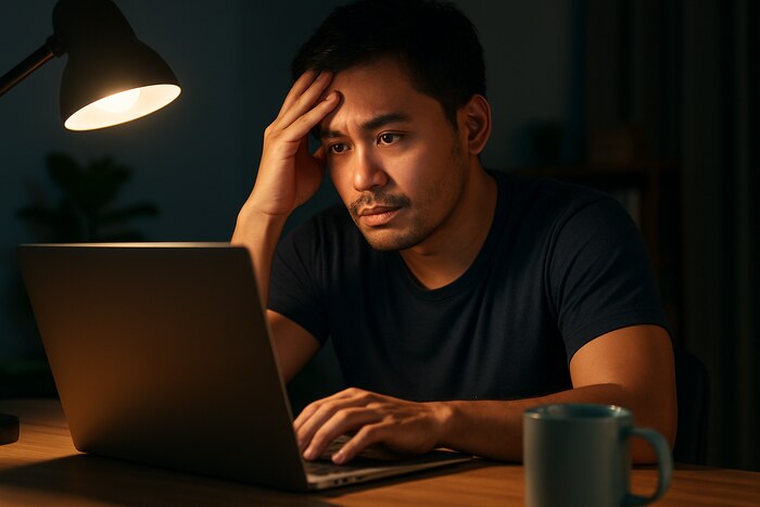Seorang pria tampak serius bekerja di depan laptop pada malam hari dengan suasana ruangan yang redup. Gambar: AI