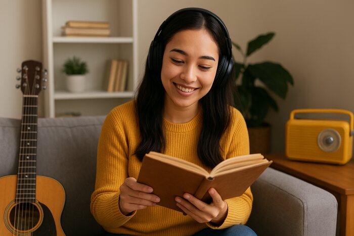 Ilustrasi Seorang perempuan muda mengenakan headphone sambil membaca buku di sofa, ditemani gitar akustik dan radio retro di sampingnya. Gambar: AI
