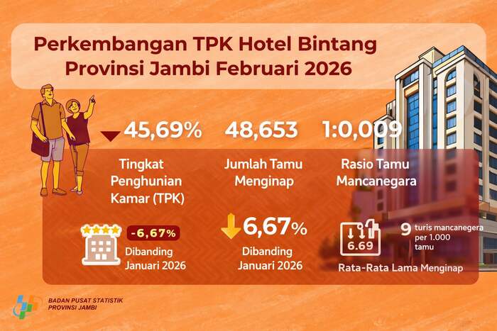 Dalam rilis resmi tertanggal 1 April 2026, TPK hotel bintang di Provinsi Jambi tercatat sebesar 45,69 persen. Angka ini lebih rendah dibandingkan Januari 2026 yang mencapai 47,38 persen.