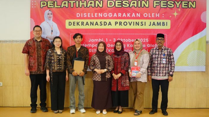 SIDAKPOST.ID, JAMBI – Ketua Dewan Kerajinan Nasional Daerah (Dekranasda) Provinsi Jambi, Hj. Hesnidar Haris, SE, (Hesti Haris) menghadiri sekaligus membuka Pelatihan Desain Fesyen yang diselenggarakan oleh Dekranasda Provinsi Jambi di Gedung Karunia Global School, Kota Jambi, Rabu (01/10/2025) pagi.
